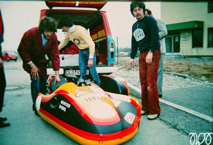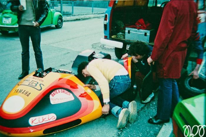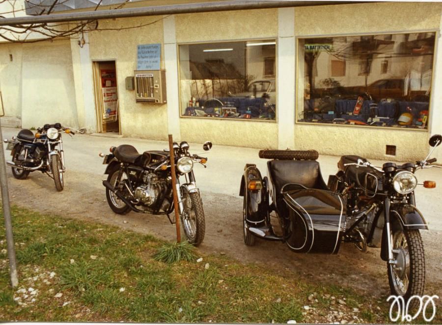 Das Dreirad ist ein MT10-Gespann von Dnjepr – Mitte: Honda CB350Four – links: Yamaha RD250
